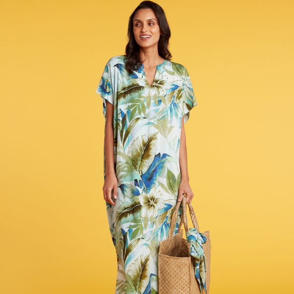 A long dress perfect for vacations. Effortless silhouette, split V-neck, dolman sleeves, pullover shape, rounded hem and side slits to the knee, ankle length. 100% Spun Jam World Rayon.