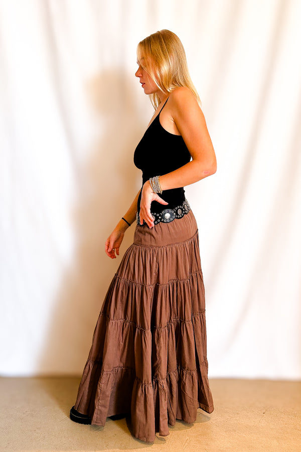 A great full length tiered maxi Skirt. Skirt is made of a light voile cotton material that is light weight and flows nicely. Skirt has a functional drawstring so you can cinch it how you like, to fit up high on the waist or low on the hip. Skirt is lined.