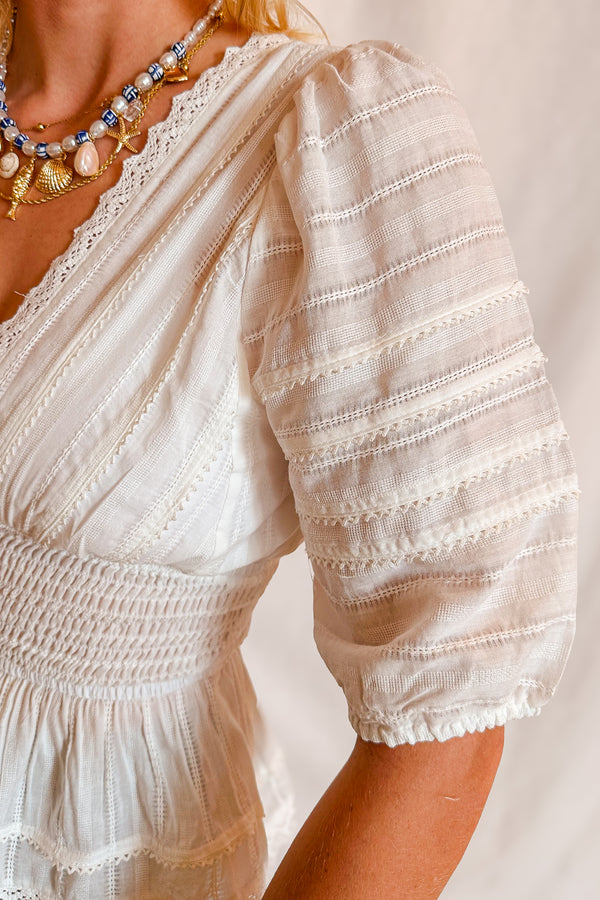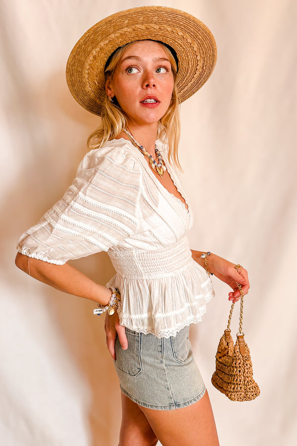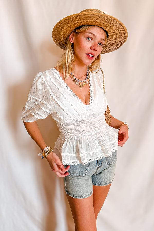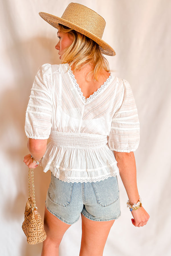 Eyelet Stretch Waist Peplum Short Sleeve Top / Ivory