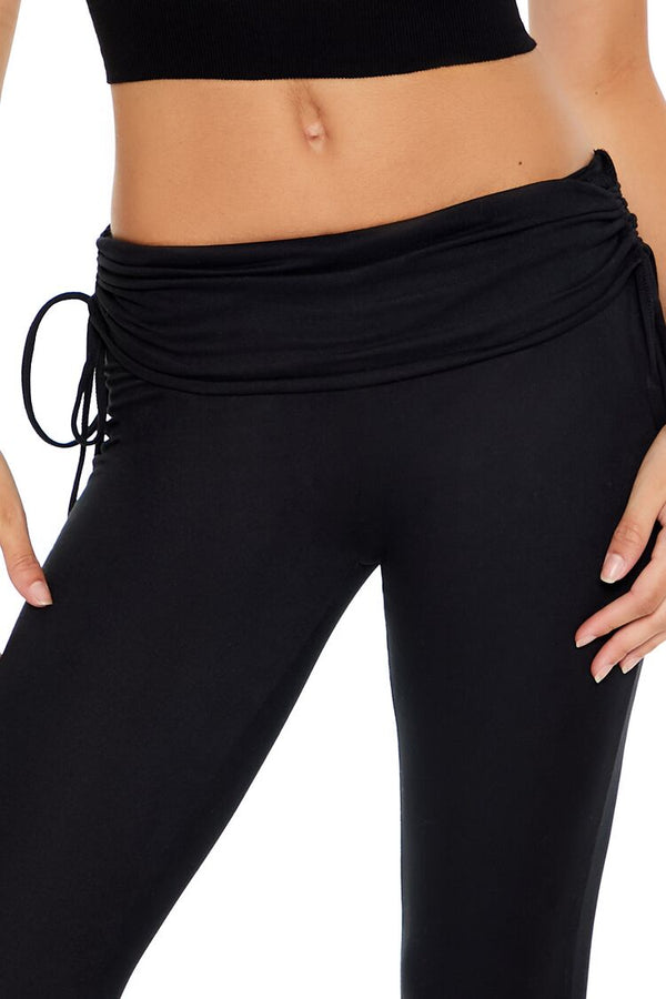 A knit pair of pants featuring a ruched foldover waistband, high rise, self-tie side closures, and a flare leg.