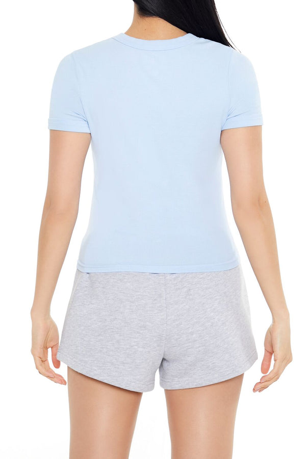 A knit baby tee featuring front ‘Gumby’ and ‘Surf’s Up!’ text, accompanying surfing character graphic, short sleeves, a round neckline, and semi-cropped hem.