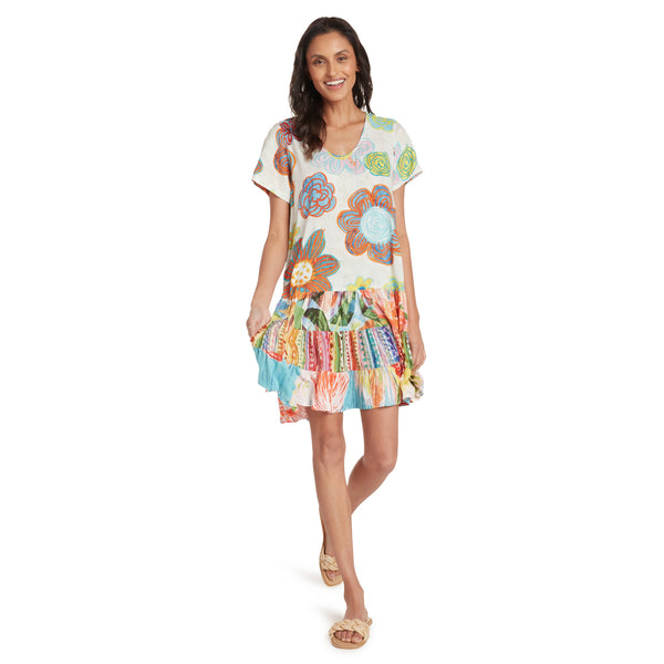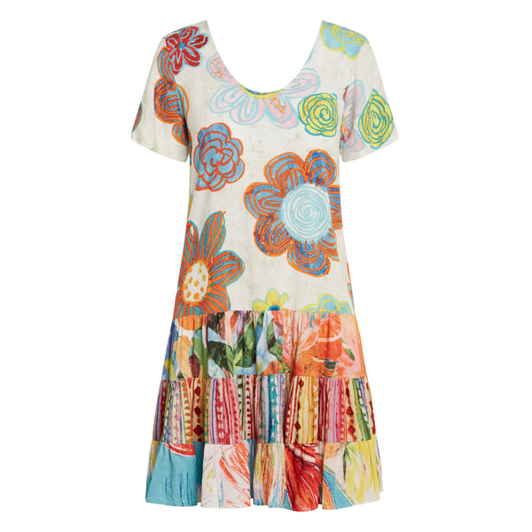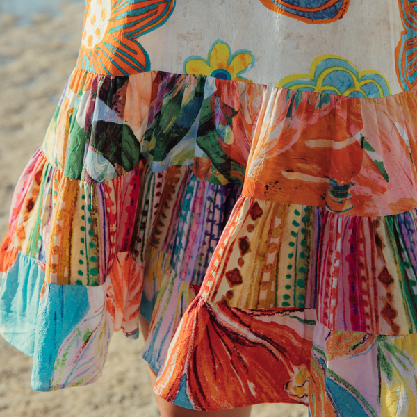 Our classic, extremely comfortable style. Deep U-neckline, dropped waist, three layers of ruffles. 100% printed rayon.