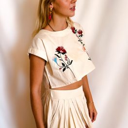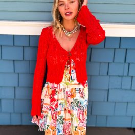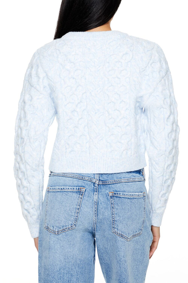 A honeycomb knit sweater featuring ribbed trim, a crew neck, long sleeves, and cropped hem.