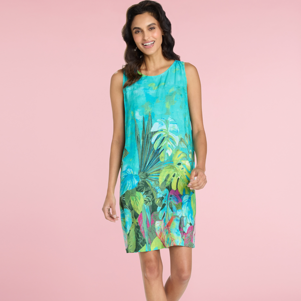 A sleek shift dress, reminiscent of the 1960s, with a jewel neckline at the front and a gathered back yoke. 100% spun rayon.