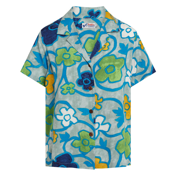 A timeless camp shirt or Hawaiian shirt for women. Features a one-piece collar, button front, and side slits for a comfortable fit. 100% Spun Jam. World Rayon.