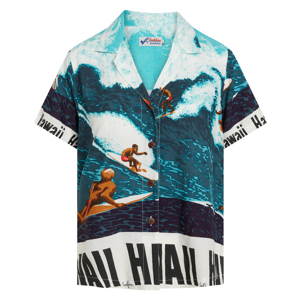 A timeless camp shirt style. One-piece collar, button-down front, side slits for easy fit. Hand-painted buttons. 100% printed rayon.