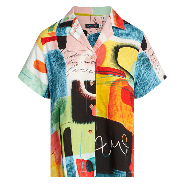 A timeless camp shirt or Hawaiian shirt for women. One-piece collar, button-down front, side slits for easy fit. 100% spun jam. World Rayon.