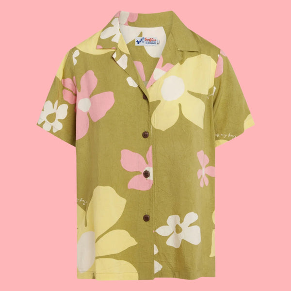 A timeless camp shirt or women’s Hawaiian shirt. Features a collar, button front, and side slits for a comfortable fit. 100% Spun Jam, World Rayon.