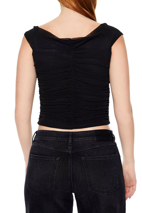 A mesh knit top featuring a V-neckline, shoulder straps, bustier-inspired design, ruched construction, and a cropped hem.