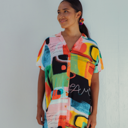 A classic and versatile button-down dress. Dropped shoulders. Back pleats for an effortless fit. Hand-painted buttons. 100% Spun Jams World Rayon