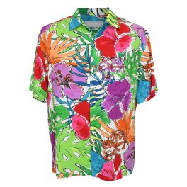 A timeless camp shirt or Hawaiian shirt for women. One-piece collar, button-down front, side slits for easy fit. 100% spun jam. World Rayon.
