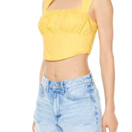 A poplin crop top featuring shoulder straps, a square-cut neckline and back, ruffle trim, ruched bust, corset-inspired design, seamed construction, and a curved hem.