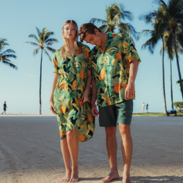 A timeless camp shirt or women’s Hawaiian shirt. Features a collar, button front, and side slits for a comfortable fit. 100% Spun Jam, World Rayon.