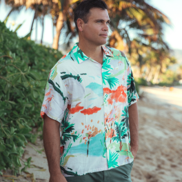 A timeless camp shirt style. One-piece collar, button-down front, side slits for easy fit. Hand-painted buttons. 100% printed rayon.