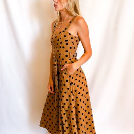 One of our more flattering dress shapes this season. This dress has a zip closure in the back. Dress has a snug upper body fit with no stretch and with its seam detailing has the look for a corset waist fit. Pucker detailing at the hip. Dress has pockets. Fabric content: 100% linen